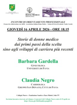 Storie di donne medico, dai primi passi della scelta sino agli sviluppi di carriera più recenti, sono al centro degli incontri con l’Associazione Italiana Donne Medico – Sezione Pavia, presieduta da Nadia Cerutti. Il prossimo appuntamento riservato alla comunità collegiale del Nuovo si terrà il 16 aprile ore 18.15 con Barbara Gardella, ginecologa (Università di Pavia) e Claudia Negro, Gruppo San Donato, Città di Pavia.